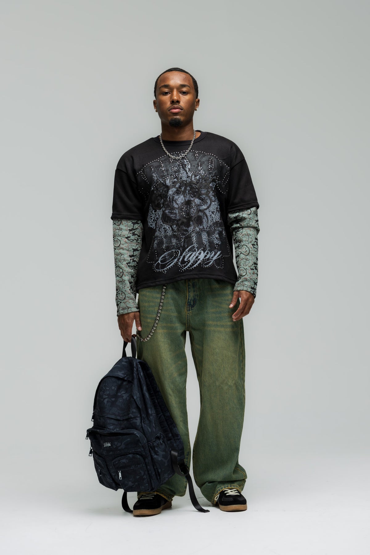 - Front Full Size Jumbo Screen Print Design With Rhinestones.