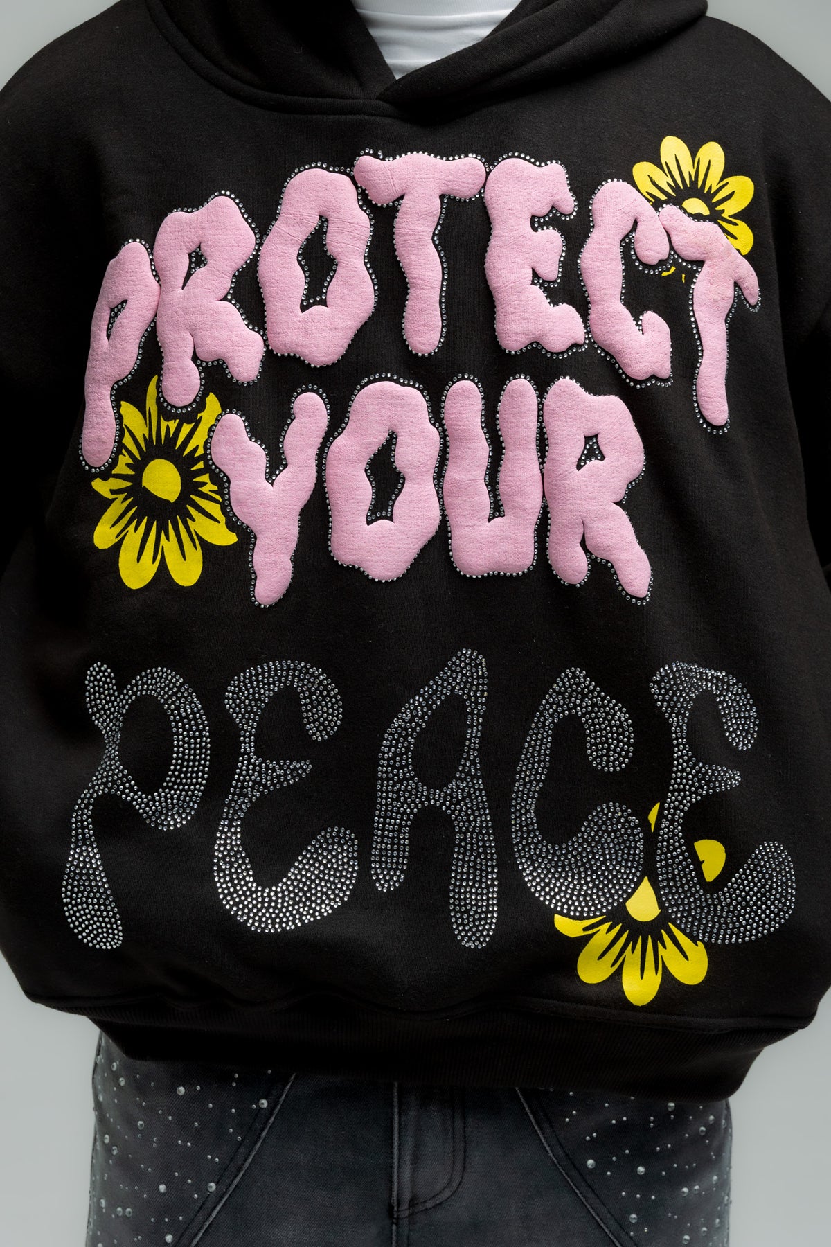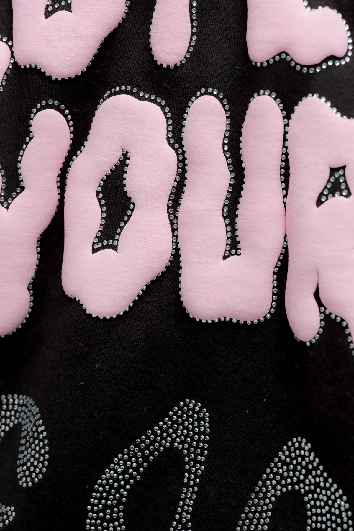 - Bold Jumbo Puff Print Design Enhanced With a Rhinestone Outline.